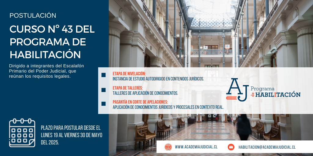 La Academia Judicial invita a postular a los y las integrantes del Escalafón Primario del Poder Judicial, que reúnan los requisitos legales y deseen cursar el curso N°43 del Programa de Habilitación para optar al cargo de Ministro o Ministra y Fiscal o Fiscala Judicial de Corte de Apelaciones, que constará de: